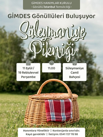 GİMDES Gönüllü Hanımlar Kurulu, milâdi 2025-2026, hicrî 1447 yılı faaliyetlerine güzel bir başlangıç yapıyor. Yeni dönemin ilk etkinliği olarak, 11 Eylül Perşembe günü saat 11.00’de Süleymaniye Camii bahçesinde hanımlar arası piknik buluşması gerçekleştirilecek.