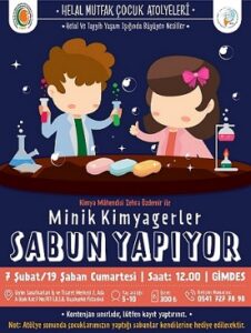 Her ay düzenlediğimiz Helal Mutfak Çocuk Atölyemizde bu ay çocuklarımızla bilim dolu, mis kokulu bir serüvene çıkıyoruz! Minik kimyagerlerimizle birlikte doğal ve helal içerikler kullanarak kendi sabunlarımızı tasarlıyor, hem el becerilerimizi geliştiriyor hem de sabunun eğlenceli dünyasını keşfediyoruz. Eğlenirken öğreneceğimiz bu keyifli deneyime 5-10 yaş aralığındaki çocuklarımızı bekliyoruz.